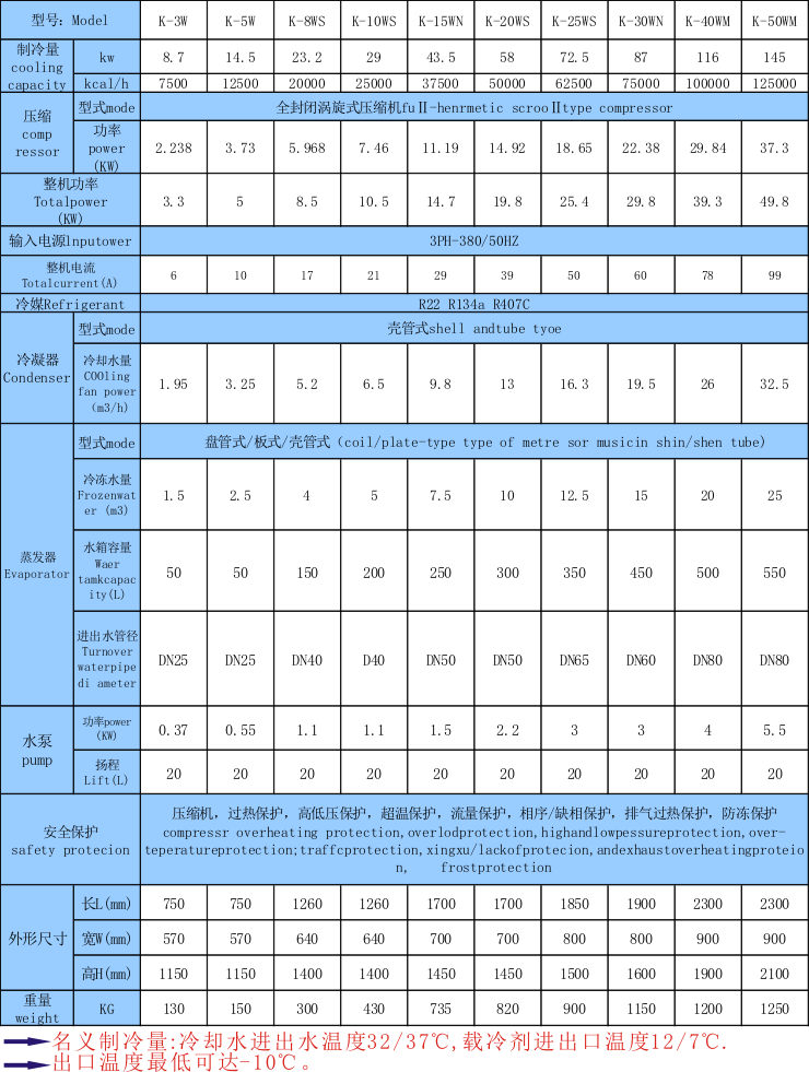 1.壓縮機采用SANYO(三洋)、COPELAND(谷輪)等歐美日名廠進口品牌全封閉全新原裝優質渦旋式壓縮機及各國名廠控制部件和高效殼管式冷凝器、蒸發器組合,超強制冷、寧靜省電,運行可靠,效率高,噪音低。